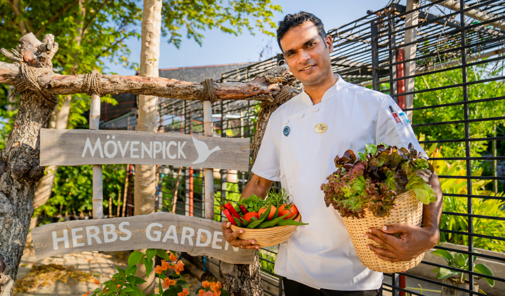 Skoraj 70 kilogramov najbolj svežih zelišč, ki jih gostom postrežejo z okusnimi jedmi, prihaja z zeliščnega vrta Mövenpick na otoku. Kar se je začelo s par rastlinami, da postanemo samozadostni in imamo neprekinjeno, trajnostno oskrbo z osnovnimi sestavinami, je zdaj prišlo do zelo lastne hidroponske kmetije in vrta. Poleg zelišč se zelenjava in sadje gojijo tudi iz organskih metod z uporabo okolju prijaznih kompostov, sestavljenih iz kuhinjskih odpadkov in suhih listov.