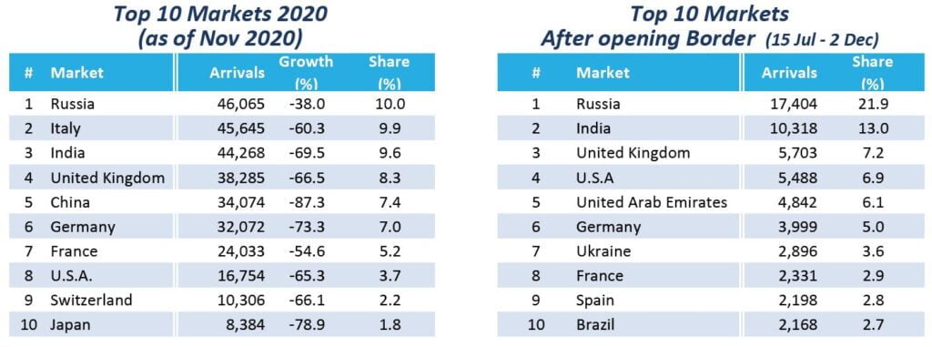 Glede na skupne prihode po ponovnem odprtju meje (od 15. julija do 2. decembra) ostaja Rusija s 17.404, sledi ji Indija z 10.318 turisti. Združeno kraljestvo je skočilo na tretje mesto s 5.703, ZDA pa na četrtem mestu s 5.488. Drugi glavni trgi po ponovnem odprtju meje vključujejo Združene arabske emirate, Nemčijo, Ukrajino, Francijo, Španijo in Brazilijo. Sem spadajo prihodi v novembru, kjer so nekateri trgi podrli rekorde iz novembra 2019, kot so: