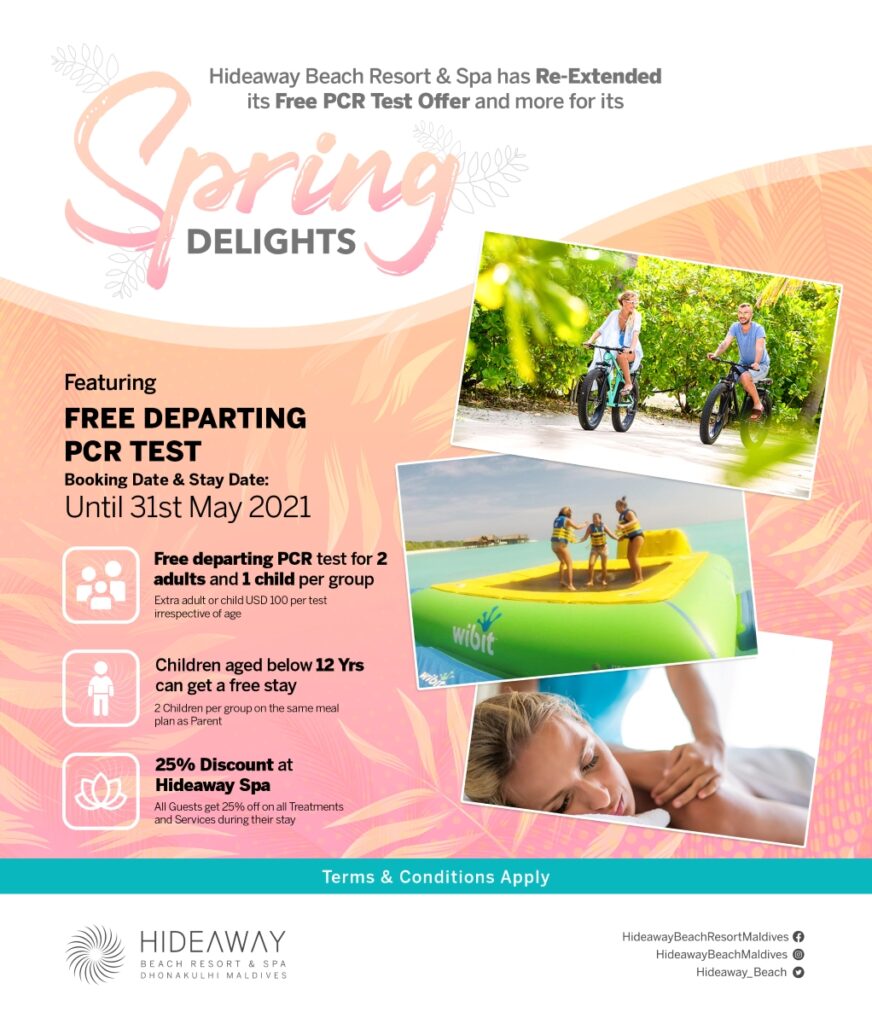 Ta priljubljena ponudba je še enkrat podaljšana za dva meseca do konca maja 2021. Prvotna ideja je bila pomagati gostom, da odhajajo samozavestno, brez skrbi, da bi morali plačati test PCR, in ustvarili čim bolj poenostavljen in enostaven postopek od relativne varnosti in udobja letovišča, ne da bi morali potovati drugam. Ta ureditev pomaga pri zmanjševanju tveganj in gostom in osebju zagotavlja, da so čim bolj varni pred ulovom COVID-19. Da bi to dosegli, so naše naravno družbeno oddaljene vile odlično bivališče, da se gostje primerno socialno distancirajo in se počutijo mirno, meditirajo in razmišljajo o stvareh, ki v življenju sprožijo veselje. V sezoni, ki je namenjena občutkom prenove po naporni zimi, gostje vseh starosti potrebujejo dober oddih. Hideaway je idealen protistrup, ki preprečuje blues, saj odlično pobegne pred vsemi skrbmi in daje popolno priložnost za življenje “Hakuna Matata” – še posebej, če najbolje izkoristite 25% popust v spa Hideaway. V letovišču je tudi zabaven velikonočni program, ki se dogaja prav zdaj, od 1. aprila do 5. aprila, in vključuje kuriran izbor aktivnosti Serene, Gusto, Active in Chill – recimo, da se najde nekaj za vsakogar. Torej, za goste vseh starosti: Pridite odkriti zasluženo skrivališče, kjer se lahko spočijete, sprostite in napolnite. Tako kot pomlad se boste tudi vi vrnili domov, kjer se boste počutili prenovljeni in povezani z najboljšimi.