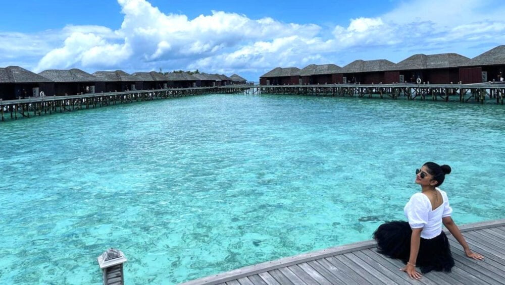 Očarana od čudovitih odtenkov turkizne, zelene in bele barve, je Megha ves čas delala na snemanju in deljenju številnih vznemirljivih trenutkov med počitnicami na Maldivih. Zlasti na njenih zgodbah na Instagramu lahko ujamemo utrinke navdušujočih trenutkov, kot je ogled ogromnih Manta Rays pod vodo in večerja za mizo, ki je videti kot maldivski čoln (Dhoni).